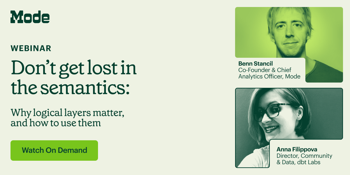 Want to stay up with the times of data? Join us for a conversational webinar between Anna Filippova, Director, Community & Data at dbt Labs, and Benn Stancil, co-founder and Chief Analytics Officer at Mode, on the return of semantic layers, and what they mean for the data industry in 2023 and beyond.